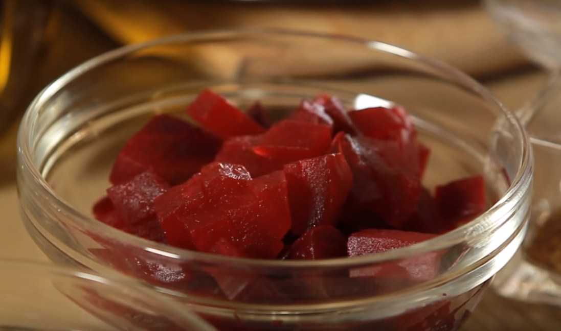 Никаких сложностей в приготовлении блюда не возникает, готовится оно просто. Можно сэкономить время на варку свеклы и потратить его на декорирование салата. Его поверхность следует притрусить мелко нарубленной луковой зеленью, чтобы получить пикантные нотки. Красиво смотрится мозаичный узор, выполненный из зеленого горошка и гранатовых зерен.