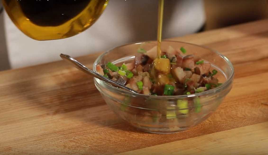 3. Следующим отправляем сельдь нарезанную мелкими кубиками. Прежде смешайте её с мелко нарубленным луком, заправив столовой ложкой масла. Так салат будет более сочным.