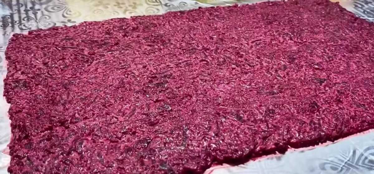 7. Ну и покрывать наше творение будет варёная свёкла натёртая на крупной тёрке. Она должна не просто покрывать крышу салата, а ещё и боковые части. Это будет выглядеть очень красиво и аппетитно!