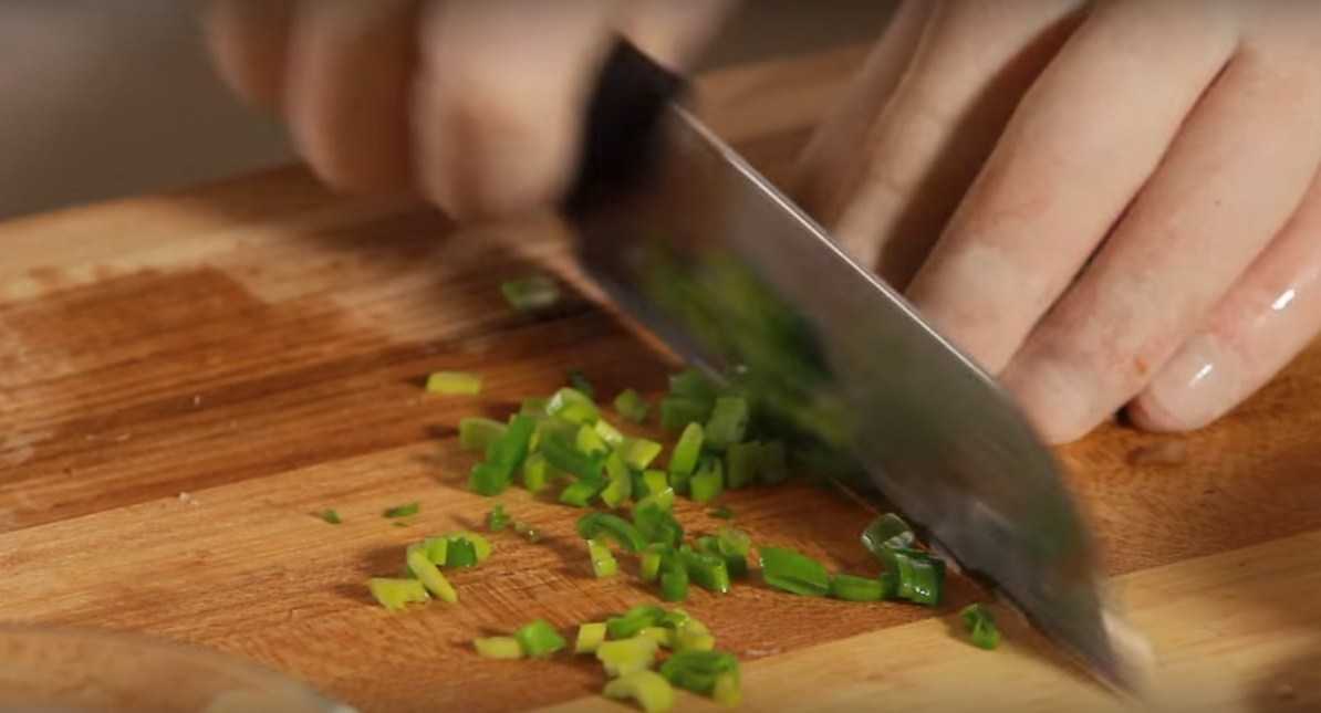 - Отварные яйца поделить на белки и желтки. Белки пропустить сквозь мелкую терку. Лук нарезать как можно мельче.