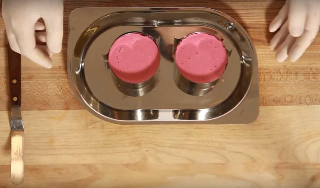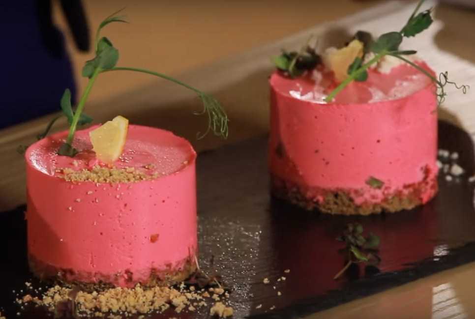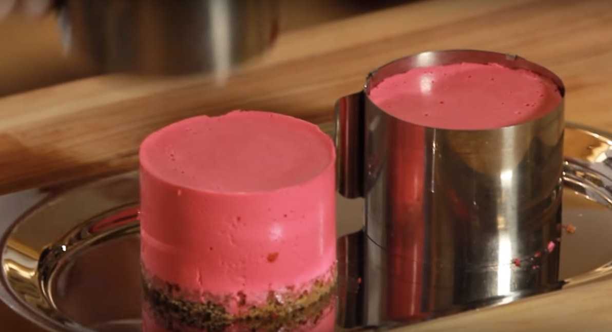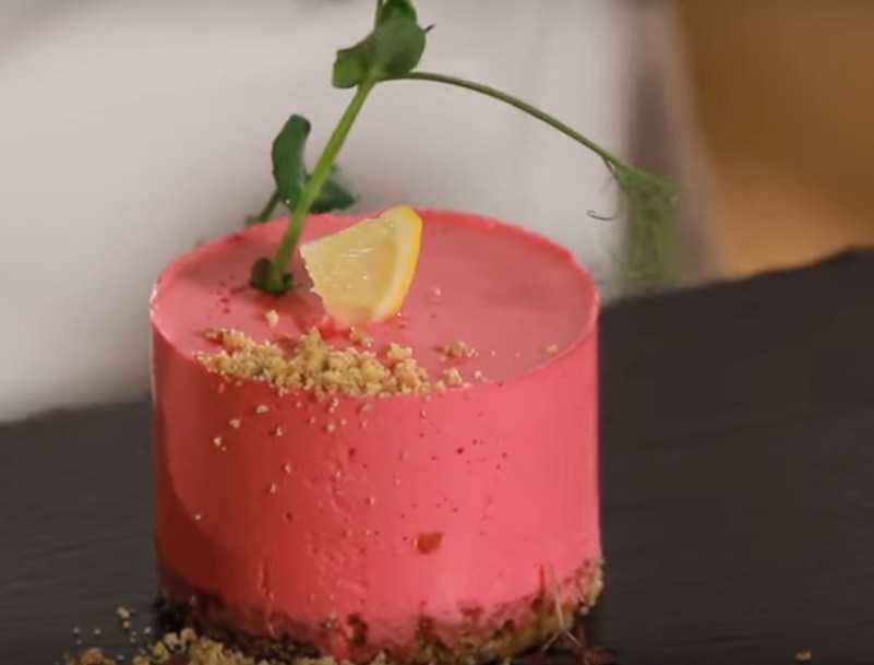 Ну что же на этом всё! После застывания перед самой подачей аккуратно удалите формочку. Дополните готовый малиновый тортик украшением из зелени и маслин.