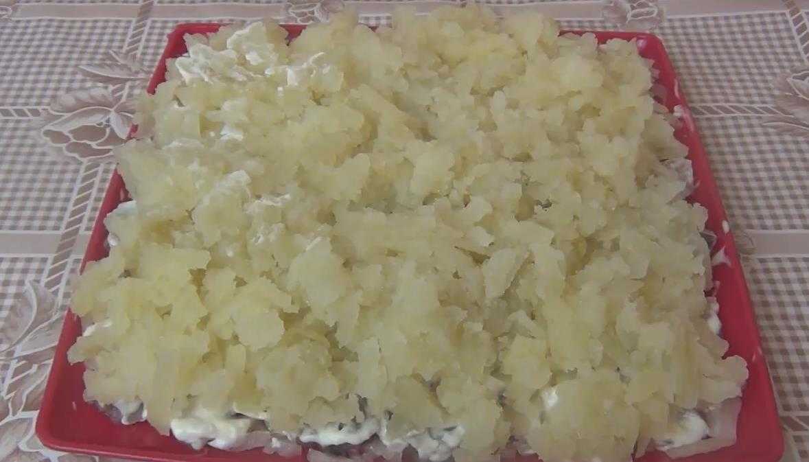 - Следующий слой – картофельный, его тоже сдобрить майонезом.