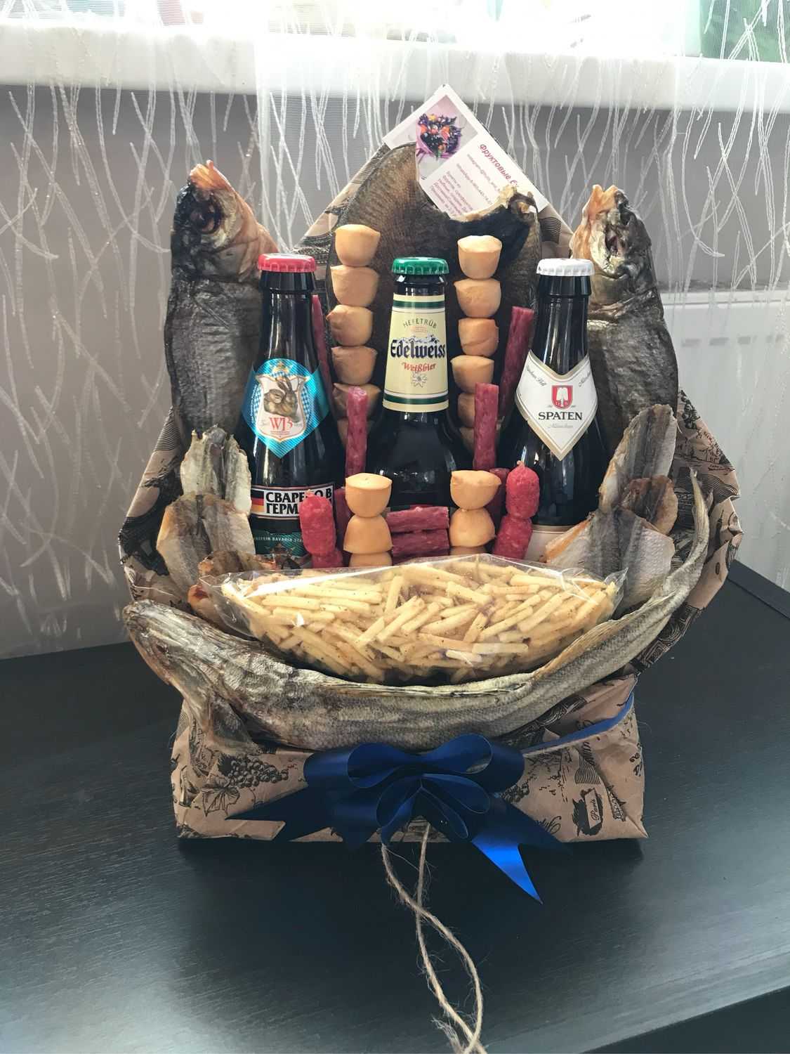 Наиболее часто делают «необычное» из «обычного» — букеты из пива в бутылках и баночках. Здесь используют самые разные идеи для сочетания из «пенного» напитка и закусок: пиво плюс колбаски, пиво плюс сыр, пиво плюс морепродукты типа сушеных кальмаров и креветок, пиво плюс отваренные до готовности раки, пиво плюс соленые закуски (кириешки, орешки типа фисташек, чипсы, сухарики, сушеная рыба, крекеры и т. д.). Добавляем хлеб, булочки, багеты, нарезку. Украшаем красным стручковым перцем, головками чеснока или лука, любыми овощами, дополняем лимонами и лаймом, обильно сдабриваем зеленью!