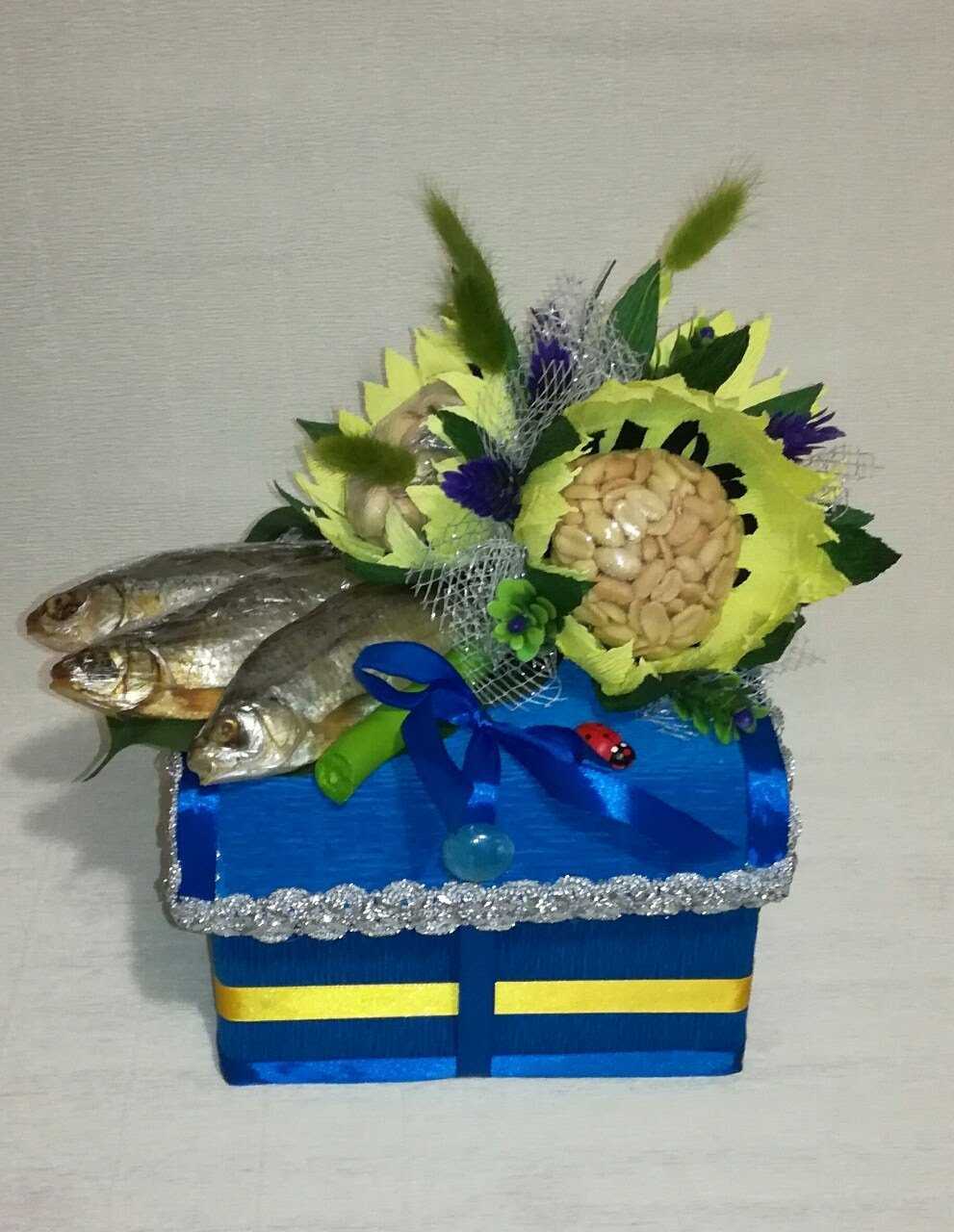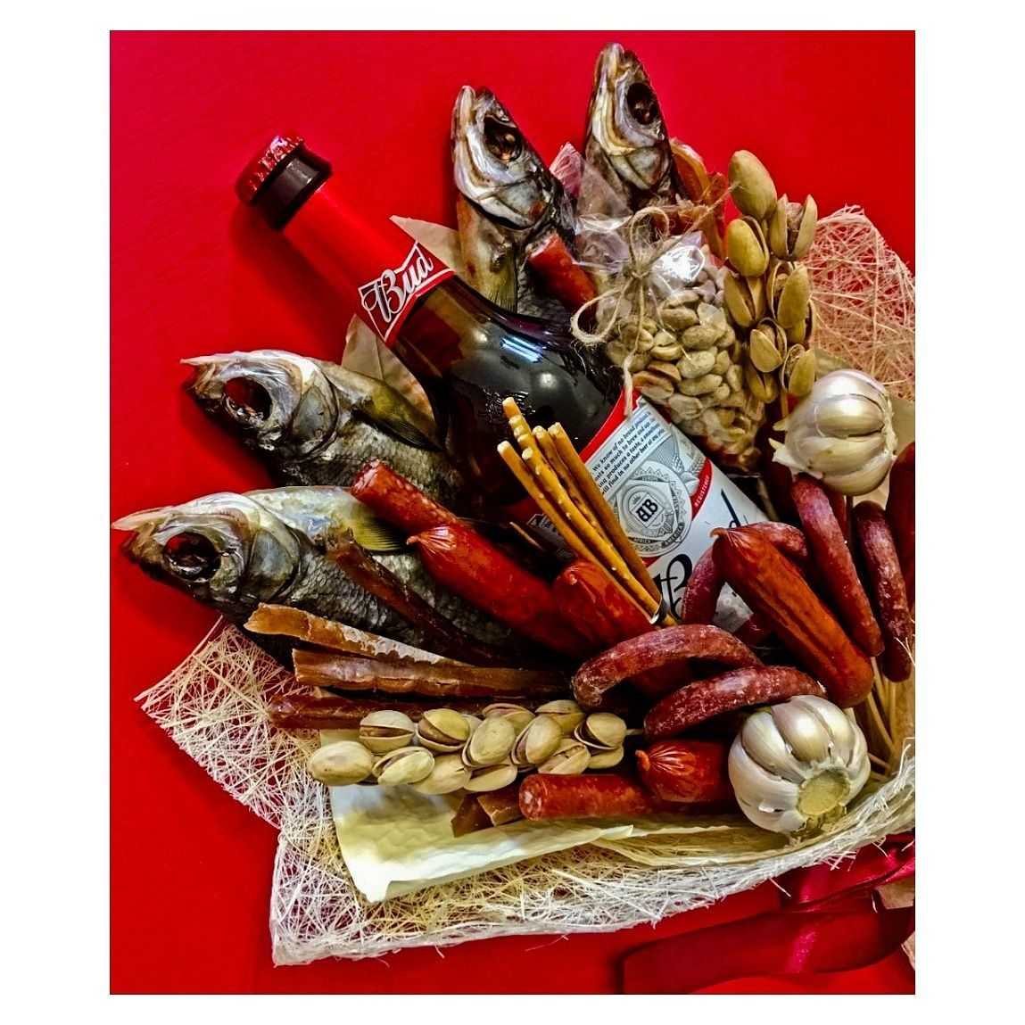 Закуской, которая также должна быть в съедобном букете, может быть сушеная или вяленая рыба, копченые колбаски, орешки, арахис и даже подсолнечные семечки – словом, любые любимые закуски мужчины.