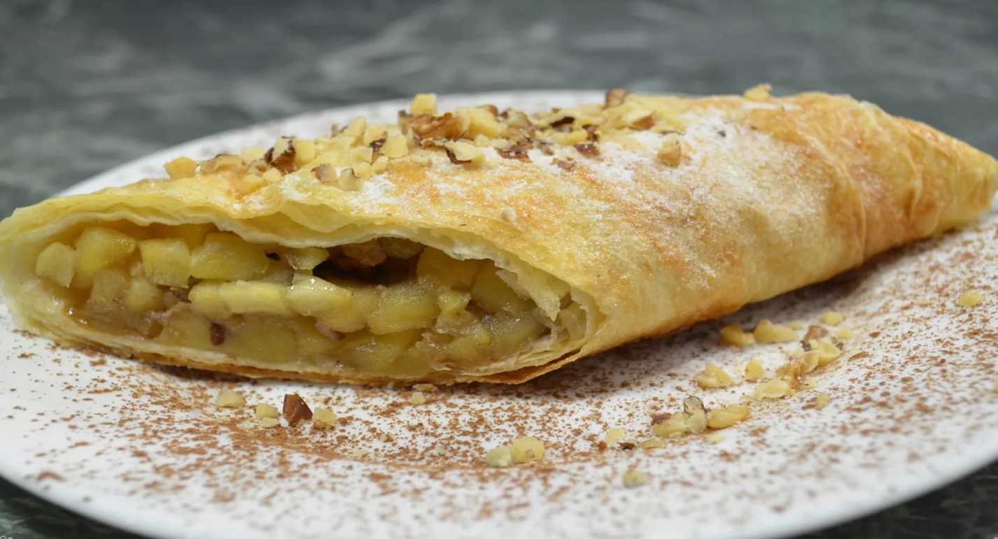 - Затем выкладываем яблочную начинку на одну половину лаваша. Загибаем внутрь бока, чтобы начинка не вывалилась и сворачиваем лаваш рулетом.