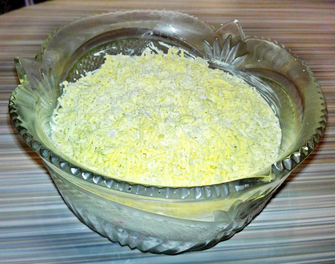 Совет : если праздничный ужин уже скоро, и ждать, пока салат пропитается, некогда, слои можно отдельно смешать с майонезом еще до того, как начать выкладывать их в общую салатницу.