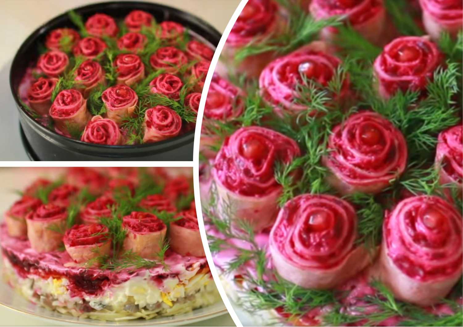 - Поставьте в холодильник салат для пропитки минимум на 1 час. Затем достаньте и украсьте по своему желанию. Самый простой способ — сделать по контуру опушку из тертого на мелкой терке белка, а середину «закрасить» желтком. Также можно выложить листики петрушки, а из тонко нарезанных слайсов отварной свеклы скрутить розочку, которая будет в центре композиции.