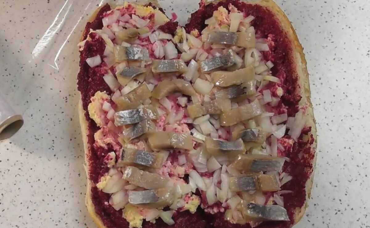 Состав и вкус салата ничем не отличается от традиционного — те же слои в привычном порядке.
