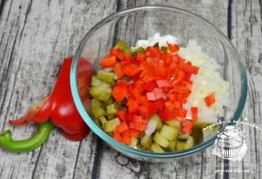 14. Добавляют репчатый лук и болгарский перец, нарезка должна быть самой мелкой.