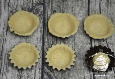 - Тесто выкладываю в формочки и распределяю, чтобы заполнить все фигурные изгибы, при этом тесто нельзя тянуть, а по толщине стеночки будущих тарталеток должны быть не толще 7 мм.