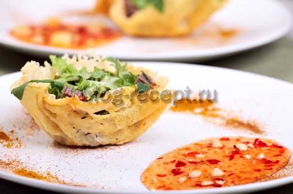 Тарталетки из сыра еще часто называют корзинками. В них хорошо подавать не слишком сочные салаты с густой заправкой. Заправленные маслом не подходят, так как в стенках сырных корзинок могут быть дырочки, через которые оно будет вытекать.