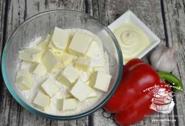 - Масло измельчите, смешайте с определённым количеством муки, затем добавьте все другие составляющие по списку и вымесите тесто до однородной, мягкой консистенции.