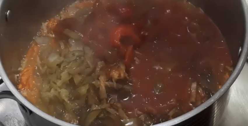 Шаг 6. В жареные овощи добавить томатный соус или измельченные свежие помидоры. Для улучшения цвета и вкуса, массу еще немного пожарьте.