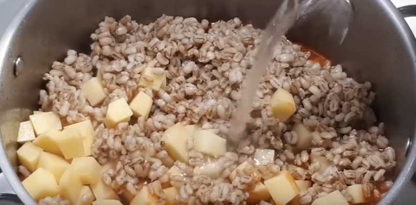 5. Добавьте к зажарке картофель и перловку, залейте кипящей водой и перемешайте. Варите рассольник до готовности картофеля.
