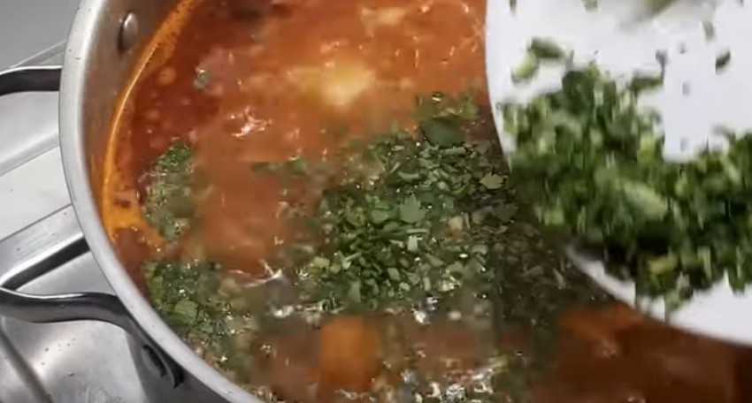 - Мелко порезанная петрушка и чеснок добавляются в рассольник, после чего кастрюля сразу снимается с огня.