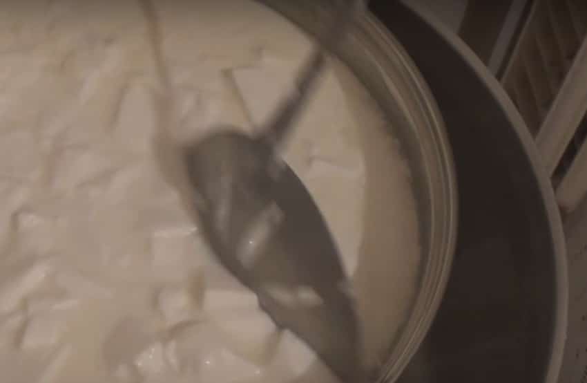 - После сквашивания молока сгусток нагрейте до 55–60 °С. Это предельный уровень для жизни молочнокислых бактерий. Как только нагреете до нужной температуры, выключайте.